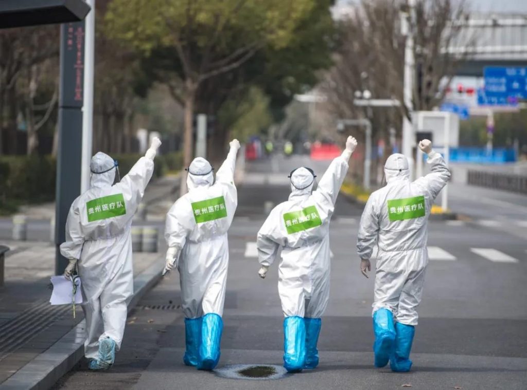 貴州醫(yī)療隊隊員在送別康復(fù)患者后慶祝。