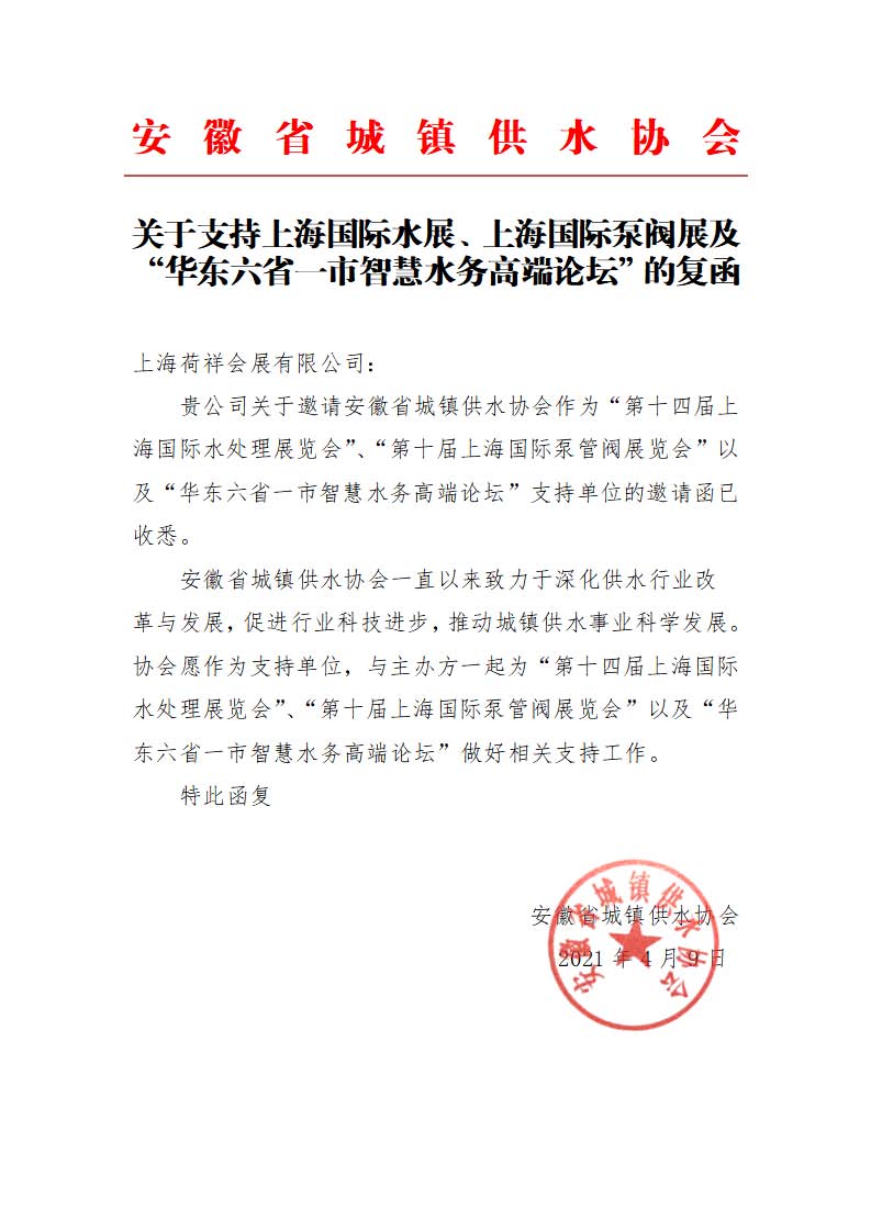 為幫助安徽省水務(wù)企業(yè)進(jìn)一步開拓市場,促進(jìn)國內(nèi)外企業(yè)之間的經(jīng)貿(mào)合作與技術(shù)交流,安徽省城鎮(zhèn)供水協(xié)會決定將全力支持 2021 年 6 月 2 日在上海國家會展中心(虹橋)舉辦的2021華東六省一市智慧水務(wù)高端論壇,與主辦方上海荷祥會展有限公司攜手為城鎮(zhèn)水務(wù)行業(yè)搭建一個(gè)國際性商貿(mào)交流平臺,助力企業(yè)更好的抓住行業(yè)機(jī)遇,積極促進(jìn)我國城鎮(zhèn)水務(wù)行業(yè)在"十四五"期間獲得快速發(fā)展。