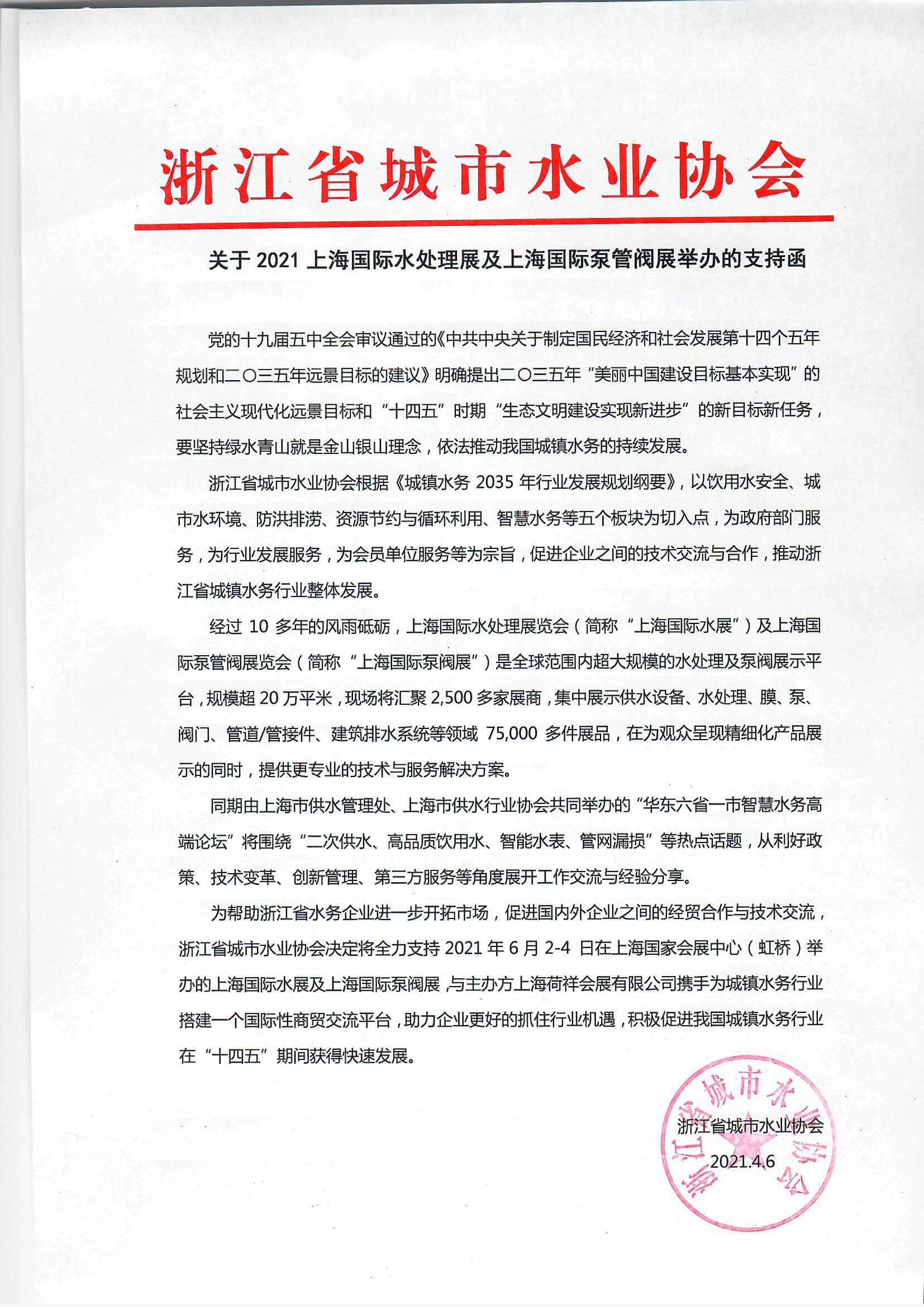 為幫助浙江省水務(wù)企業(yè)進(jìn)一步開拓市場(chǎng),促進(jìn)國內(nèi)外企業(yè)之間的經(jīng)貿(mào)合作與技術(shù)交流,浙江省城市水業(yè)協(xié)會(huì)決定將全力支持 2021 年 6 月 2-4 日在上海國家會(huì)展中心(虹橋)舉辦的上海國際水展及上海國際泵閥展,與主辦方上海荷祥會(huì)展有限公司攜手為城鎮(zhèn)水務(wù)行業(yè)搭建一個(gè)國際性商貿(mào)交流平臺(tái),助力企業(yè)更好的抓住行業(yè)機(jī)遇,積極促進(jìn)我國城鎮(zhèn)水務(wù)行業(yè)在"十四五"期間獲得快速發(fā)展。