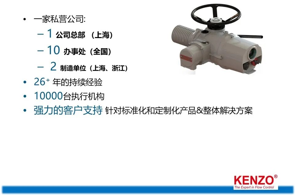 肯佐控制設備(上海)有限公司總部位于上海市青浦區(qū)練塘工業(yè)園區(qū)。公司擁有2個制造工廠,占地70余畝;主要生產(chǎn)智能型電動執(zhí)行機構(gòu)及齒輪箱,是一家致力于電動執(zhí)行機構(gòu)研發(fā)、生產(chǎn)、銷售和服務的專業(yè)公司。