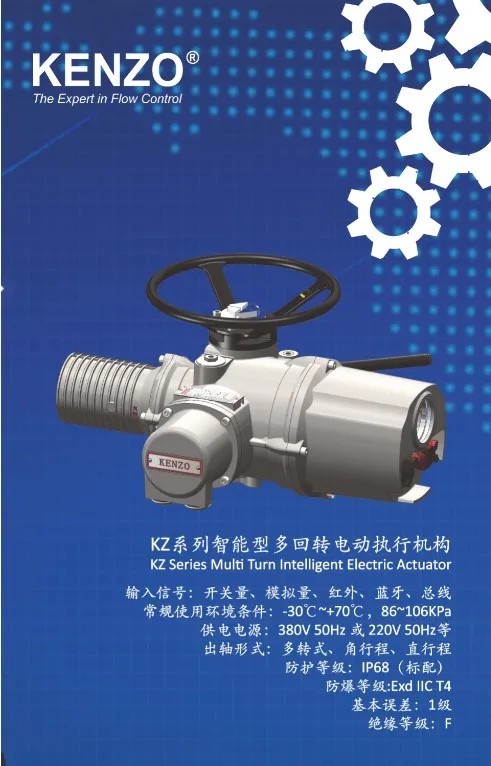 肯佐控制設備(上海)有限公司生產(chǎn)的新一代智能型kz系列電動執(zhí)行機構(gòu),可以通過一個獨立的設定器對其進行非侵入性的快速設定、檢查及查詢。執(zhí)行機構(gòu)采用大屏液晶顯示器,以中文、數(shù)字、圖形等形式顯示執(zhí)行機構(gòu)的轉(zhuǎn)矩、閥門位置、限位設定等工作狀態(tài)和報警,極大地方便了用戶的操作使用。