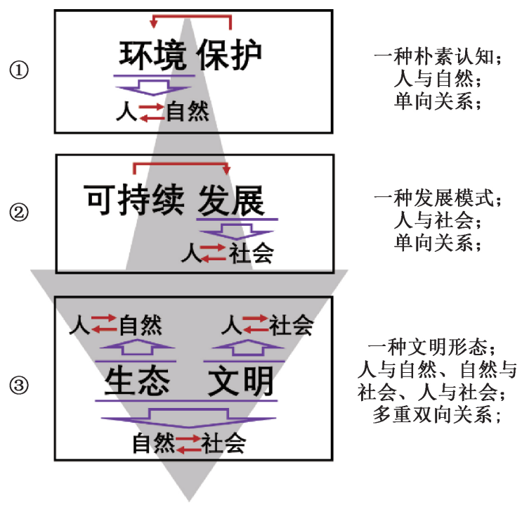 “生態(tài)文明”的概念,描述的則是一種歷史上未曾出現(xiàn)過的文明形態(tài)。它提出以“人與自然、自然與社會、人與社會和諧共生、良性循環(huán)、全面發(fā)展、持續(xù)繁榮”為基本宗旨的社會形態(tài)。它的內(nèi)涵包括而又超越之前的認(rèn)識,“生態(tài)”兩字反映著人與自然的關(guān)系,保護(hù)自然同時享用自然;“文明”兩字反映著人與自然、社會之間的關(guān)系,人類要敬畏自然,個人服從社會,同時社會支撐個人的發(fā)展;“生態(tài)”與“文明”銜接,反映著自然與社會之間的關(guān)系,自然以資源的方式為社會提供物質(zhì)基礎(chǔ),社會以科技的方式尊重自然?!吧鷳B(tài)文明”概念,蘊(yùn)含多重雙向關(guān)系,超越了狹義的“環(huán)境保護(hù)”以及“可持續(xù)發(fā)展”,在關(guān)注“人與自然”關(guān)系的傳統(tǒng)觀念基礎(chǔ)上,增加了對“自然與社會”和“人與社會”之間和諧關(guān)系的強(qiáng)調(diào),是對環(huán)境保護(hù)概念的一次創(chuàng)造性升級深化,為人類文明的走向提供了一種超越“工業(yè)文明”的新形態(tài),即,這是一種“生態(tài)”的“文明”,這種“文明”以文明的方式對待“生態(tài)”。