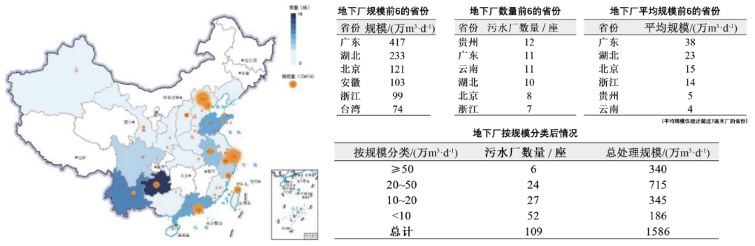 客觀上,我國地下污水處理廠建設(shè)呈現(xiàn)逐年增長的趨勢,發(fā)展十分迅速。據(jù)不完全統(tǒng)計,截至2020年底,我國地下污水處理廠數(shù)量達(dá)到109座,總處理規(guī)模1 586萬m3/d,其中半數(shù)地下廠規(guī)模超過10萬m3/d,近半數(shù)污水由20萬~50萬m3/d區(qū)間規(guī)模的大型地下廠處理,為全世界地下廠數(shù)量最多的國家。具體來說,我國地下污水處理廠分布具有明顯的地區(qū)集中性特點(diǎn),主要分布于環(huán)渤海、長三角和珠三角等經(jīng)濟(jì)發(fā)達(dá)地區(qū),以及地貌較復(fù)雜的云貴川區(qū)域。如圖3所示,以污水處理規(guī)模計,地下廠規(guī)模最大的省份分別為廣東、湖北和北京,日處理規(guī)模均超過百萬立方米,其中廣東省規(guī)模居首,達(dá)到417萬m3/d。以數(shù)量計,擁有最多地下廠數(shù)量的省份分別為貴州、廣東和云南,均達(dá)到10座以上。不同地域的地下污水處理廠,其污水處理規(guī)模具有顯著差異,云、貴兩省的地下廠規(guī)模相對較小,平均規(guī)模4萬~5萬m3/d;而北京、浙江的地下廠平均規(guī)模相對較大,達(dá)到14萬~15萬m3/d;而廣東、湖北地下廠平均規(guī)模較大,分別為23萬m3/d、38萬m3/d。地下污水處理廠已經(jīng)成為“十四五”期間市政污水處理行業(yè)的新增長點(diǎn)。