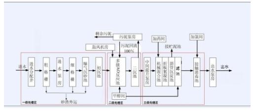 典型的污水廠處理工藝流程是上述方法的組合。以某一級a標準污水處理廠為例,從進水到出水主要分三級處理區(qū),一級處理區(qū)主要應(yīng)用物理法(包括攔截、沉淀、除砂等)及一定的化學法(初沉池前絮凝);二級處理區(qū)是污水處理工藝核心,主要是以活性污泥為主的生化反應(yīng)(酶促反應(yīng));三級處理區(qū)主要應(yīng)用物理化學法,通過混凝、過濾、消毒等工藝手段對污水進行深度處理。落實到具體處理工程中,各級各類技術(shù)需針對不同污染物和污染情況進行應(yīng)用和改進。