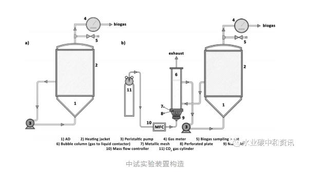 眾所周知,co2是在消化過程中伴隨著甲烷產(chǎn)生的產(chǎn)物。而另一方面,利用厭氧消化進(jìn)行co2捕集固定是一種潛力十足的碳減排策略。兩個處理食品垃圾的厭氧消化試驗(yàn)進(jìn)行了225 d監(jiān)測,實(shí)驗(yàn)組定期使用氣泡柱充入co2(fernandez et al.)。實(shí)驗(yàn)組測試ch4產(chǎn)率為0.56±0.13 m3ch4/kgvs·d(對照組為0.45±0.05 )沼氣中ch4濃度為68%,額外攝取了外源co20.55 kg,h2濃度增加了2.5 倍,這歸因于co2溶解以及酸化與產(chǎn)氫途徑改變。