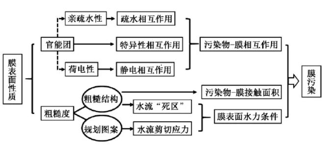 因此,全面總結(jié)膜污染與膜表面性質(zhì)相關(guān)性方面的研究進(jìn)展,對(duì)膜材料研發(fā)和膜污染控制具有重要的指導(dǎo)意義。根據(jù)污染物不同,膜污染類型可分為有機(jī)污染、無(wú)機(jī)污染、結(jié)垢污染和生物污染4大類。有機(jī)污染主要由進(jìn)水中的腐殖質(zhì)、多糖和蛋白質(zhì)等溶解性有機(jī)物導(dǎo)致,對(duì)應(yīng)膜污染研究中常用的模型污染物分別為腐殖酸(ha) 或富里酸(fa) 、海藻酸鈉(sa) 和牛血清蛋白(bsa) 。無(wú)機(jī)污染是由水體中的鋁、鐵、硅等無(wú)機(jī)膠體和微粒造成的污染,而結(jié)垢污染一般指的是鈣等二價(jià)陽(yáng)離子的碳酸鹽、硫酸鹽和磷酸鹽以及硅酸等物質(zhì)在膜表面的結(jié)晶或沉積。生物污染則由粘附在膜表面的微生物及其代謝產(chǎn)物引起,二者共同形成生物膜后會(huì)進(jìn)一步加重生物污染。在實(shí)際應(yīng)用中,通常出現(xiàn)的是由多種污染物共存造成的復(fù)合污染,并且進(jìn)水水質(zhì)的差異也會(huì)導(dǎo)致膜污染的主要類型有所不同。影響膜污染行為的關(guān)鍵性質(zhì)主要包括膜表面的親疏水性、荷電性、官能團(tuán)種類以及粗糙度(詳見(jiàn)圖1) 。前3項(xiàng)理化性質(zhì)決定了膜材料與特定污染物之間的疏水作用、靜電作用以及氫鍵等特異性相互作用,而膜表面粗糙度則通過(guò)粗糙結(jié)構(gòu)、規(guī)則圖案等形貌特征影響污染物與膜的接觸面積以及錯(cuò)流過(guò)濾時(shí)膜表面的水力條件。