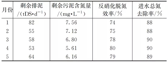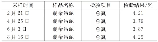 微生物在生長(zhǎng)繁殖過(guò)程中,會(huì)攝取污水中一部分氮來(lái)合成自身細(xì)胞組分,采用《城鎮(zhèn)污水處理廠污泥檢驗(yàn)方法》(cj/t 221-2005)第49章中的方法對(duì)剩余污泥中氮含量進(jìn)行檢測(cè),檢測(cè)時(shí)間為2020年,檢測(cè)結(jié)果見(jiàn)表1。
