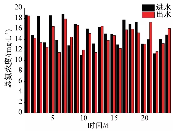 再生水廠以3.75萬(wàn)m3/d規(guī)模生物池為研究對(duì)象,控制該生物池污泥濃度為6 500 mg/l、水溫23 ℃、混合液回流比為500%、生物池好氧區(qū)前、中、后段do分別為1.5 mg/l、1.2 mg/l以及0.5 mg/l。對(duì)好氧段進(jìn)出水的總氮濃度變化進(jìn)行檢測(cè),結(jié)果如圖1所示。