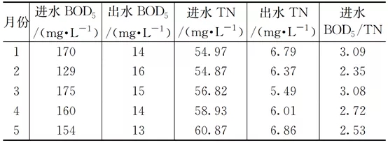 然而在實(shí)際運(yùn)行過(guò)程中,受回流液中do濃度的影響,反硝化效率很難達(dá)到理論值。如表2所示,再生水廠2021年1月至5月進(jìn)水bod5/tn的平均值為2.75,低于2.86的理論值。日常該水廠生物池內(nèi)回流比為350%左右,按照式(2)計(jì)算理想狀態(tài)下的脫氮效率為78%,在未投加外加碳源的情況下生物系統(tǒng)實(shí)際反硝化脫氮效率為77%(見(jiàn)表3)??紤]剩余污泥排放中攜帶的氮含量,進(jìn)水總氮平均去除率為89%。