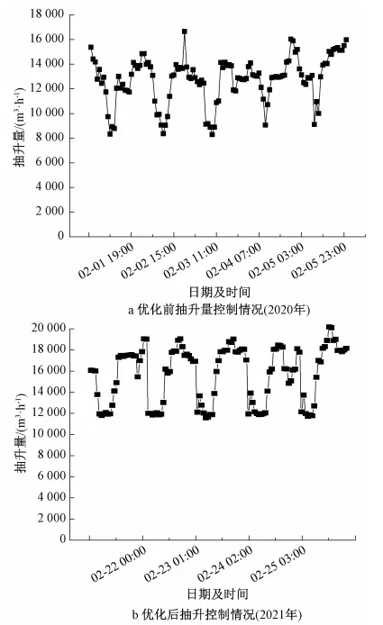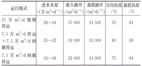 再生水廠結(jié)合來(lái)水時(shí)變化及日變化規(guī)律,通過(guò)生物池及膜池間歇停運(yùn)的方式(見(jiàn)表4),提高日水力負(fù)荷至70%以上。并充分利用上游污水管網(wǎng)調(diào)蓄功能,控制瞬時(shí)最低抽升量不低于運(yùn)行曝氣池負(fù)荷的60%(見(jiàn)圖3b)。