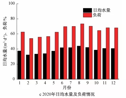 受城市生產(chǎn)活動(dòng)的影響,污水處理廠在實(shí)際運(yùn)行過(guò)程中不同時(shí)段、季節(jié)來(lái)水水量呈規(guī)律性波動(dòng)。水力負(fù)荷過(guò)低或水量時(shí)變化系數(shù)過(guò)大對(duì)回流液do濃度、內(nèi)回流比等脫氮重點(diǎn)指標(biāo)控制會(huì)帶來(lái)一定困難。以再生水廠2020年來(lái)水情況為例,水量峰谷差值比例超過(guò)50%(見(jiàn)圖3a),瞬時(shí)最低負(fù)荷僅為設(shè)計(jì)值的30%。不同月份水量差異也較為明顯,最低負(fù)荷僅為設(shè)計(jì)值的53%(見(jiàn)圖3c)。