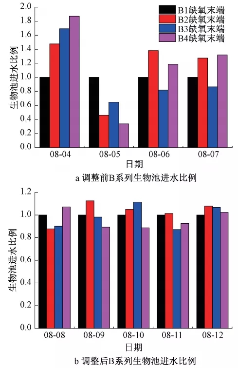 如圖5所示,開(kāi)展配水優(yōu)化工作后,各生物池間進(jìn)水均勻度明顯提升,同一系列各生物池間進(jìn)水比例差值由33%降低至15%左右。