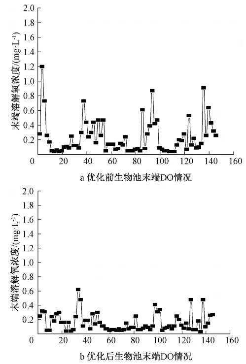 通過(guò)配水優(yōu)化、抽升控制、生物池倒運(yùn)等方式,穩(wěn)定生物池水力負(fù)荷。優(yōu)化后,生物池do穩(wěn)定性明顯提高(見(jiàn)圖6b),末端do濃度基本低于0.5 mg/l,滿足反硝化對(duì)于do濃度的要求,同時(shí)大大降低了回流液中的do對(duì)于進(jìn)水碳源的浪費(fèi)。
