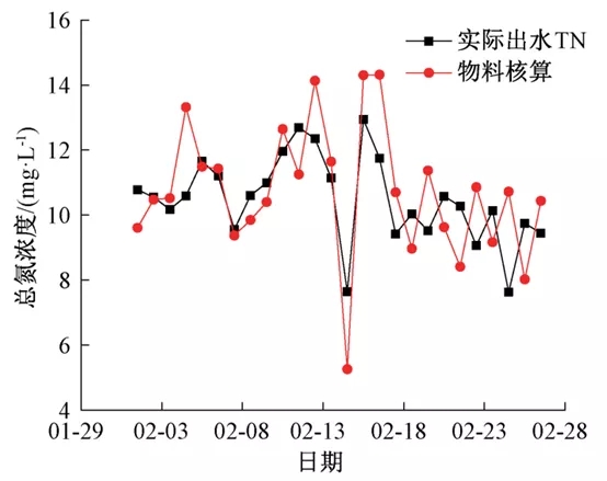 以再生水廠2020年2月份的實(shí)際出水tn與物料平衡方程模擬出水tn進(jìn)行對(duì)比,結(jié)果如圖7所示。