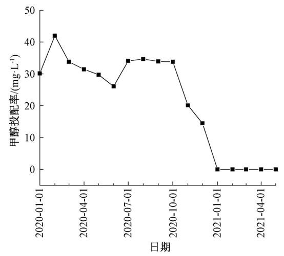 (4) 通過(guò)建立氮的物料平衡模型,對(duì)工藝運(yùn)行參數(shù)進(jìn)行過(guò)程控制,再生水廠甲醇投配率逐漸降低,于2021年實(shí)現(xiàn)了碳源零投加。