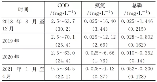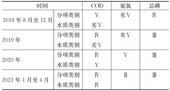 練江流域新一輪的整治工作重點中,加強污水處理產(chǎn)及配套管網(wǎng)的建設(shè)以擴大污水收集能力及處理能力,配合河道清理、清淤及垃圾處置,流域水質(zhì)不斷改善。海門灣橋閘斷面2018年至2021年的水質(zhì)監(jiān)測數(shù)據(jù)見表1和表2。