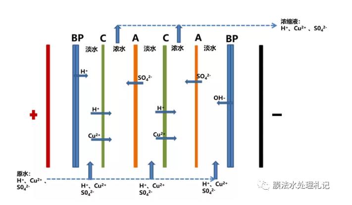 我們知道金屬離子一般是通過極膜滲透至極水室,而電滲析常規(guī)所用的極膜都屬于陽離子交換膜,甚至有些還以全氟磺酸膜為極膜,在金屬溶液的系統(tǒng),它基本都會中招。系統(tǒng)避免溶液中的金屬離子進入極室,上面原理圖只是一個參考,同樣市場上也有用陰膜做極膜、單價選擇性離子交換膜做極膜等,有興趣的可以再去做些延伸。