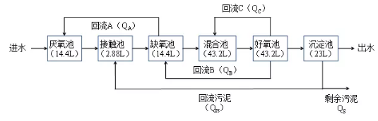 小試裝置為變形uct工藝,由有機(jī)玻璃材質(zhì)制成,長×寬×高為1.44 m×0.3 m×0.3 m,有效容積為120 l,通過擋板分為5個(gè)反應(yīng)區(qū)。小試裝置反應(yīng)區(qū)構(gòu)成及其體積如圖1所示。每個(gè)反應(yīng)池設(shè)有攪拌器,在混合池及好氧池底部各均勻布置6個(gè)曝氣頭。好氧池末端連接23 l柱狀沉淀池,設(shè)計(jì)表面負(fù)荷為0.64 m3/(m2·h)。為避免藻類滋生對(duì)試驗(yàn)產(chǎn)生影響,整個(gè)反應(yīng)器池體用黑色遮光布進(jìn)行遮光處理。