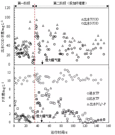 2.1 纖維素對(duì)cod與p去除的影響圖2顯示了小試裝置在整個(gè)試驗(yàn)期間出水cod與磷濃度變化。在第一階段進(jìn)水tcod濃度維持在450 mg/l時(shí),出水tcod平均為(39.7±16.1)mg/l,其中scod為(24.8±10.8) mg/l,符合國家一級(jí)a排放標(biāo)準(zhǔn)。然而,當(dāng)?shù)诙A段加入纖維素后,cod去除效果明顯惡化,出水tcod最高檢測值高達(dá)95 mg/l(scod為80 mg/l)。為探究加入纖維素后cod去除效果惡化原因,對(duì)出水tcod的構(gòu)成進(jìn)行了分析。結(jié)果顯示,加入纖維素后出水ss顯著下降,從(48.25±3.29) mg/l降至(21.34±9.71) mg/l,由此可排除污泥沉降性能惡化導(dǎo)致出水cod升高問題。纖維素富含官能團(tuán)且呈線狀,因此其對(duì)污泥具有較好網(wǎng)捕卷掃作用,可促進(jìn)污泥絮體凝結(jié)并提高其緊密度,這一現(xiàn)象通過污泥鏡檢也得到了印證。然而,不論是因纖維素自身作為cod消耗氧氣,還是導(dǎo)致污泥絮體變得緊密都有可能降低氧傳質(zhì),從而弱化了對(duì)cod的降解效率。為此,在第46 天對(duì)好氧池運(yùn)行進(jìn)行調(diào)整,將曝氣量提高至0.30~0.50 l/min(添加纖維素前為0.10~0.20 l/min)。結(jié)果,出水cod開始逐漸下降并恢復(fù)至投加纖維素前水平(tcod=49.4 mg/l,scod=34.2 mg/l)??梢?,回收纖維素對(duì)曝氣池運(yùn)行有著積極影響,可提高氧氣傳質(zhì)與利用效率。