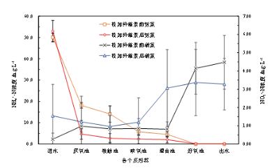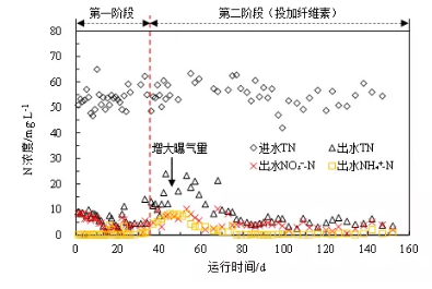 與此同時(shí),纖維素投加對(duì)磷去除的影響與cod類似,在纖維素投加初期(第36~50 天),出水總磷(tp)和正磷酸鹽(po3-4-p)濃度均開始惡化,去除率分別降低至51.99%和56.32%。從發(fā)生原因來看,do不足是導(dǎo)致磷去除效率下降的主因,可以從增大曝氣量后出水tp逐漸下降得到驗(yàn)證。然而,出水tp含量在提高曝氣量后的很長一段時(shí)間內(nèi)也沒有恢復(fù)至投加纖維素前水平,而是保持在(2.86±1.22) mg/l左右。為進(jìn)一步分析其原因,在第68 天從曝氣池末端取混合樣進(jìn)行了聚磷菌(paos)活性測定,并與投加纖維素前的活性進(jìn)行了對(duì)比。結(jié)果顯示,投加纖維素后,反應(yīng)器中paos比釋磷速率和比吸磷速率分別為11.3 和12.0mg/(gvss?h),與投加前的10.8 、13.4 mg/(gvss?h)相比變化并不是很大??梢姡w維素的投加對(duì)paos活性的影響并不大。因此,反應(yīng)器除磷效果恢復(fù)較慢的原因可能與纖維素投加初期導(dǎo)致的跑泥和生物量恢復(fù)較慢有關(guān)。2.2 纖維素對(duì)氮去除的影響圖3顯示了在投加纖維素前后裝置對(duì)氮去除效果的變化。從整體上看,反應(yīng)器無論是否投加纖維素均能夠很好地完成脫氮,投加前出水tn、nh4+-n和 no3--n平均濃度分別(5.9±3.1)、(0.40±0.96)(4.59±2.22)mg/l,投加后為(7.80±5.46)、(1.30±2.00)、(4.11±2.22) mg/l。只是在纖維素投加初期,出水tn出現(xiàn)明顯惡化,此時(shí)出水中nh4+-n明顯增多,這顯然與上述氧傳質(zhì)受限有關(guān)。圖3顯示,在增大曝氣量后對(duì)tn的去除效率迅速恢復(fù),主要是因?yàn)橄趸芰﹂_始恢復(fù)。