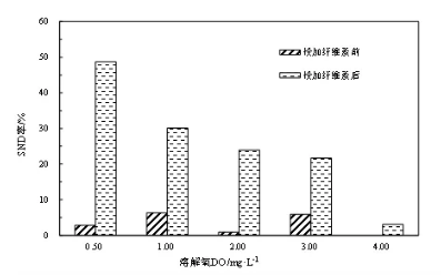 投加纖維素前后的snd效率見圖5,第一階段(未投加纖維素)無論do濃度多大,snd效率均不高(<8%);即使控制do在0.5 mg/l時(shí),snd效率也不過2.8%。相反,第二階段添加纖維素后,snd效率明顯提高,do=0.5 mg/l時(shí)達(dá)48.69%;即使do提高至3 mg/l,snd效率依然可以保持在20%。這一結(jié)果深入揭示了纖維素對(duì)絮體致密性產(chǎn)生的絮體內(nèi)do梯度之重要作用。