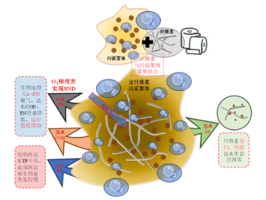 2.3 纖維素對(duì)運(yùn)行的影響纖維素對(duì)反應(yīng)器運(yùn)行影響是兩方面的,似乎均與其對(duì)污泥絮體致密程度有關(guān)。圖6總結(jié)了纖維素對(duì)反應(yīng)器運(yùn)行、能耗等方面的影響及其機(jī)理。纖維素通過自身線狀形態(tài)和官能團(tuán)可靠網(wǎng)捕卷掃作用將污泥絮體密實(shí)包裹,相當(dāng)于促進(jìn)絮凝,可降低出水ss以及其中所含n、p。