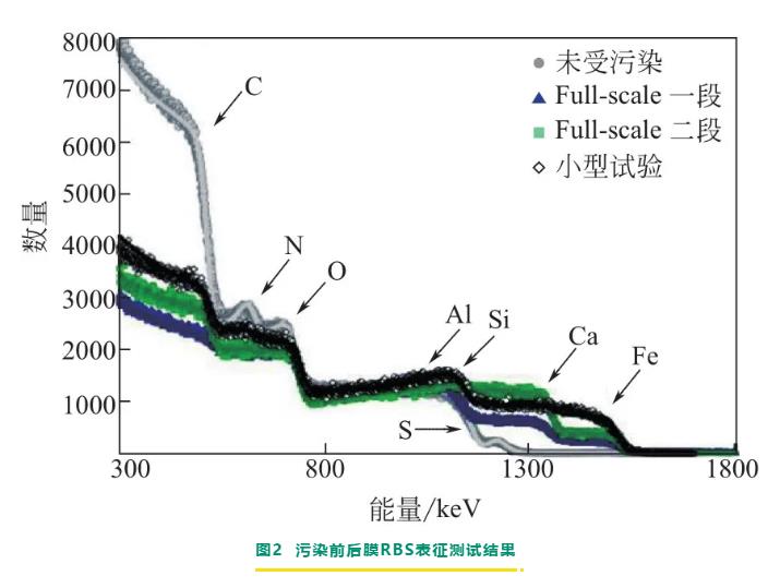 無機污染主要是由水中存在的無機鹽在膜表面逐漸累積,最終形成的無機垢所引起的。無機鹽結垢過程較復雜,常存在多種無機鹽的共沉淀和相互作用。sem、eds、xrd等結構表征和膜表面滴酸測試是常用的無機污染診斷手段。ruiz-garcía等對用于苦咸水脫鹽運行11年的反滲透膜元件進行了剖檢分析,剖檢對象選擇的是四種不同位置的膜元件,分別包含一段和二段反滲透系統(tǒng)的首末支膜。其中一段的第一支膜可以直觀地看到有褐色沉積物,二段的最末支膜可以看到有粗糙的黃色垢,經(jīng)sem-eds表征及膜表面滴酸分析,得出膜污染物主要是含有碳酸鈣和硅鋁酸鹽的無機污染。xps是常用于表征膜表面元素組成和化學結構的分析手段,但xps只能檢測膜皮層頂端,檢測深度一般只有7nm;rbs也可以用于分析膜表面元素組成和結構,且rbs檢測深度約2μm,比xps能檢測的深度更深,因此rbs還能用于檢測污染層的厚度。gorzalski等利用rbs研究膜表面污染物情況,對用于含硅地下水處理運行2.5年的納濾膜元件進行了剖檢分析,剖檢對象選擇的是一段和二段納濾系統(tǒng)的首末支膜元件。通過sem、xps、rbs等表征分析,得出膜污染物主要是含有fe、ca、si、al、s元素的無機污染,其中一段膜元件的si和al含量較高,二段膜元件的ca污染較重。表2和圖2是rbs對污染前后膜的表征結果對比,由rbs結果可得到xps無法獲得的信息,如不同工段的污染層厚度不同,并且rbs能探測整個污染層,與xps只能探測皮層所得到的si元素含量不同。