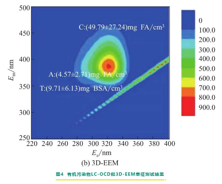 除了污染物和污染膜的表征外,水樣分析結果也可以對有機污染類型作出診斷。jeong等對用于海水淡化運行8年的反滲透膜元件進行了剖檢分析,剖檢對象選擇的是三種不同位置的膜元件,分別位于一級反滲透系統(tǒng)的前部、中部和后部。污染膜的表面可以看到有一層均勻的褐色沉積物,濃水側隔網(wǎng)和進水側污染較重,產(chǎn)水側附近污染最輕。由lc-ocd和3d-eem表征的水樣測試結果(圖4)分析可得,膜的有機污染物主要是腐殖質物質和小分子中性物質。tang等對用于城市污水回用處理運行2個月的反滲透膜元件進行了剖檢分析,該元件位于一段反滲透系統(tǒng),通過loi、ftir、doc、eem、樹脂分離等分析,得出膜污染物大部分是含不飽和碳或芳香環(huán)的微生物類和腐殖質類有機污染。許家晟等對用于自來水廠出水深度處理的碟管式納濾膜進行了膜污染分析,從膜表面可明顯看到一層較滑膩的黃色污泥層,并伴有黑色顆粒物質,且底部出水端膜片污染更嚴重。通過sem-eds分析得出,膜污染物以有機污染為主,經(jīng)ftir和3d-eem進一步分析得出,膜表面的有機污染成分主要是類富里酸物質、類腐殖酸物質及一些微生物代謝產(chǎn)物,并存在一定程度的生物污染。
