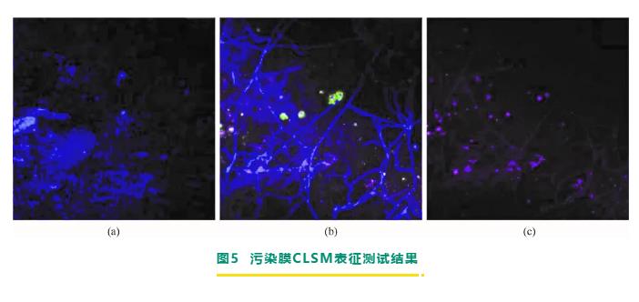 膜污染的形成與進水的水質條件關系密切,因此,對于水質成分復雜的廢水處理膜,其膜污染通常還表現(xiàn)為多種污染物的協(xié)同作用。li等對煤化工廢水處理系統(tǒng)苦咸水反滲透裝置的一段和二段ro膜元件進行了剖檢分析。針對每個膜元件樣品,隨機選擇一個膜袋并按照“九宮格”分布,每個部分裁剪10cm×10cm膜片樣本進行進一步分析表征。sem-eds、xps、atr-ftir、3d-eem等表征結果表明,沿著進水方向從第一段到第二段,有機物污染全程污染嚴重,無機污染逐漸加劇,而微生物污染呈不斷減輕的趨勢。其中有機污染物主要是蛋白質,無機污染物為ca、fe、si所形成的沉淀物。clsm可以清晰地顯示多種污染物的協(xié)同作用,圖5是clsm表征結果,圖中藍色代表β-吡喃糖,綠色代表蛋白質,粉色代表核酸,由圖可見幾種污染物明顯地互相交織在一起,從而得出膜污染存在多糖和鈣離子架橋形成的有機-無機協(xié)同污染。