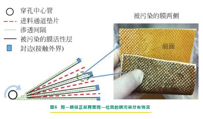 膜解剖是對膜元件進行破壞性拆解后,對膜元件進行相關內部檢測。內部檢測主要包括膜袋、膜卷原水進口端、濃水出口端、濃淡水隔網(wǎng)、膜片表面污染物的檢查。一方面可通過膜袋最外側膜片的折痕判斷產(chǎn)水背壓現(xiàn)象,另一方面通過詳細記錄的污染物顏色、性狀和氣味對膜污染情況進行初判,并對膜樣品和污染物分別進行裁剪和收集,以作后續(xù)分析。