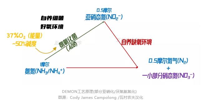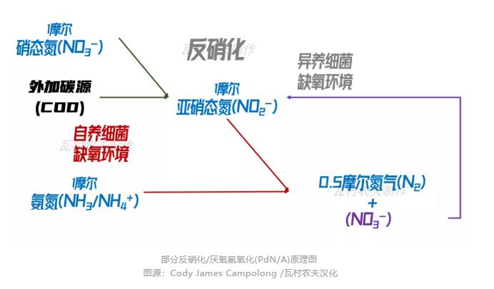 為什么要選擇進(jìn)行部分反硝化的反應(yīng)呢?請大家先再看一眼上邊的圖片:部分亞硝化/厭氧氨氧化(partial nitritation-anammox)除了能將亞硝酸鹽和氨氮轉(zhuǎn)化成氮?dú)庵?,還不可避免地生成硝酸鹽。