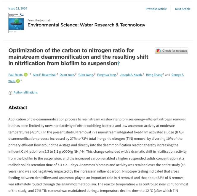 目前他們已經(jīng)有一些發(fā)表的論文成果,例如下邊這篇文章,他們發(fā)現(xiàn)改良碳氮比的過程還伴隨硝化反應(yīng)從生物膜轉(zhuǎn)移到懸浮液相中。這一個(gè)個(gè)的小發(fā)現(xiàn)都會幫助研究人員加深對pdn/a工藝關(guān)鍵控制和潛在機(jī)制的理解。