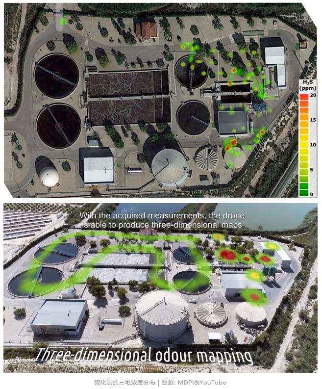 和上述兩種方法相比,使用無(wú)人機(jī)來(lái)監(jiān)測(cè)臭氣排放有許多優(yōu)點(diǎn),例如它們可以測(cè)量污水廠不同位置的關(guān)鍵嗅味化合物的濃度,包括一些過(guò)去操作人員難以到達(dá)的位置。這意味更高的空間分辨率、更低的風(fēng)險(xiǎn)和更低的成本。這些數(shù)據(jù)信息能為處理工藝提供建議反饋,優(yōu)化氣體擴(kuò)散模型,更好地預(yù)測(cè)對(duì)污水廠周?chē)某魵庥绊?,幫助廠區(qū)更好地識(shí)別無(wú)組織排放。