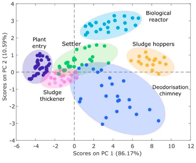 通過(guò)pca主成分分析,污水廠可以更直觀地了解不同地點(diǎn)的臭氣源類型: