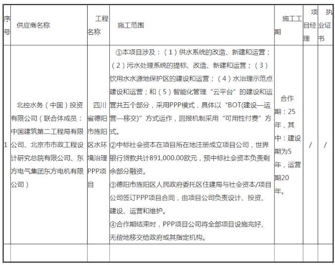 3月11日,四川省德陽(yáng)市旌陽(yáng)區(qū)水環(huán)境治理ppp項(xiàng)目采購(gòu)結(jié)果確認(rèn)談判公示發(fā)布,中標(biāo)人為北控水務(wù)(中國(guó))投資有限公司(聯(lián)合體成員:中國(guó)建筑第二工程局有限公司、北京市市政工程設(shè)計(jì)研究總院有限公司、東方電氣集團(tuán)東方電機(jī)有限公司)聯(lián)合體,中標(biāo)價(jià)為15590.26608萬(wàn)元。