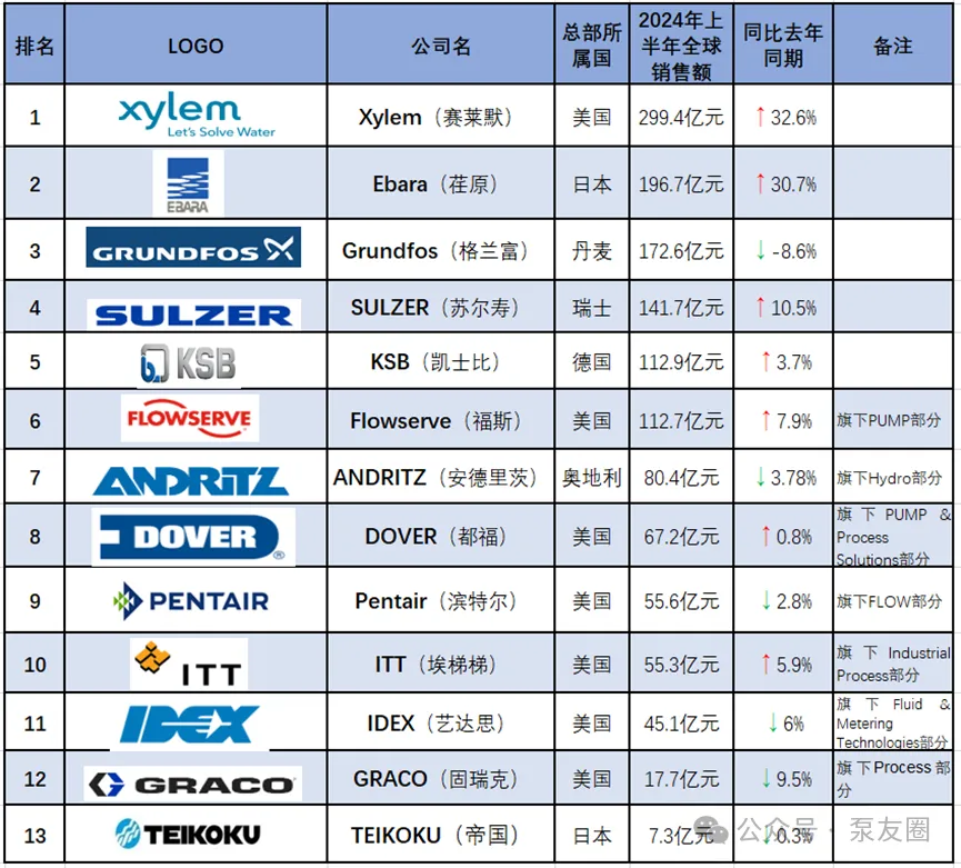 隨著2024年半年報(bào)的陸續(xù)發(fā)布,根據(jù)統(tǒng)計(jì),納入?yún)R總的13家國際知名泵企,其上半年總銷售額達(dá)到約1264.6億元人民幣,相較于去年同期的1051.74億元,總體實(shí)現(xiàn)了20.2%的同比增長。在這13家企業(yè)中,尤為值得關(guān)注的是,僅有3家企業(yè)實(shí)現(xiàn)了兩位數(shù)以上的強(qiáng)勁增長,共有7家企業(yè)實(shí)現(xiàn)了與去年同比有增幅。